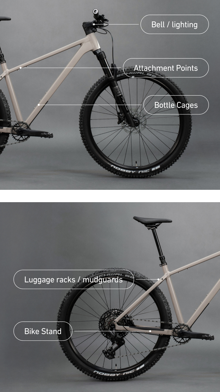 Make the PDQ AL your bike. Bottle cage and tool strap for the trail, mudguards and pannier rack for everyday use.