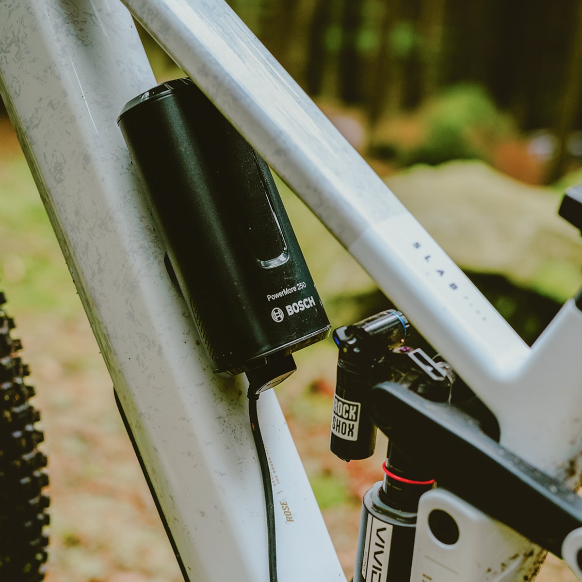Extend your range with just the size of a water bottle: The Bosch PowerMore 250 Range Extender is the fast and compact solution for even longer tours on your compatible e-bike with Bosch Smart System – e.g. the Rose Slab Plus.